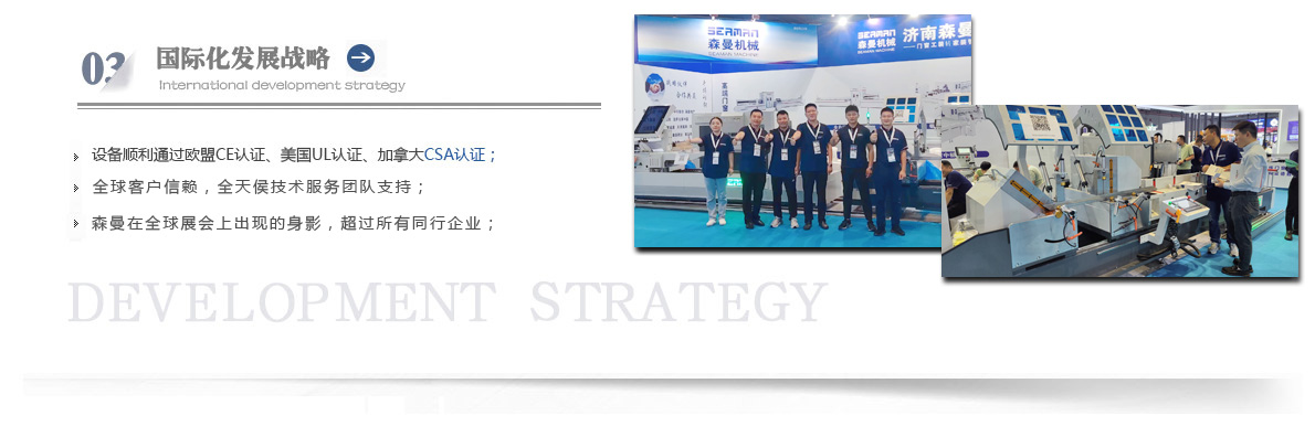 “森曼機械”作為全球門窗設備供應商,本著"seaman"精神,勇立潮頭,拼搏創(chuàng)新,以爭做行業(yè)為目標,在行業(yè)前輩發(fā)展的基礎上,努力學習,積極進取。目前公司產(chǎn)品涵蓋塑料門窗設備、鋁合金門窗設備、鋁幕墻設備、鋁木復合門窗設備及中空玻璃設備五大種類,近百個品種。公司產(chǎn)品銷售至全國各地及東南亞、非洲、東歐、北美等幾十個國家和地區(qū)。在這個競爭激烈的年代,我們正努力使我們的產(chǎn)品!